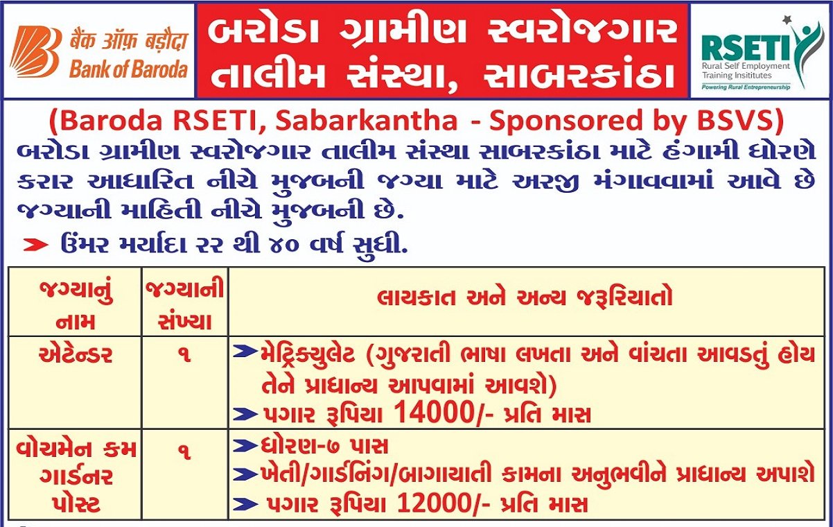 બેન્ક ઓફ બરોડા સાબરકાંઠા ભરતી 2025: બેન્ક ઓફ બરોડા દ્વારા સંચાલિત ગ્રામિણ સ્વરોજગાર તાલીમ સંસ્થા (RSETI), સાબરકાંઠા ખાતે હંગામી ધોરણે કરાર આધારિત ખાલી જગ્યાઓ માટે ભરતીની જાહેરાત કરવામાં આવી છે. આ ભરતી BSVS પ્રાયોજિત છે અને ઇચ્છુક ઉમેદવારોએ નિર્ધારિત તારીખ સુધી અરજી કરવાની રહેશે.