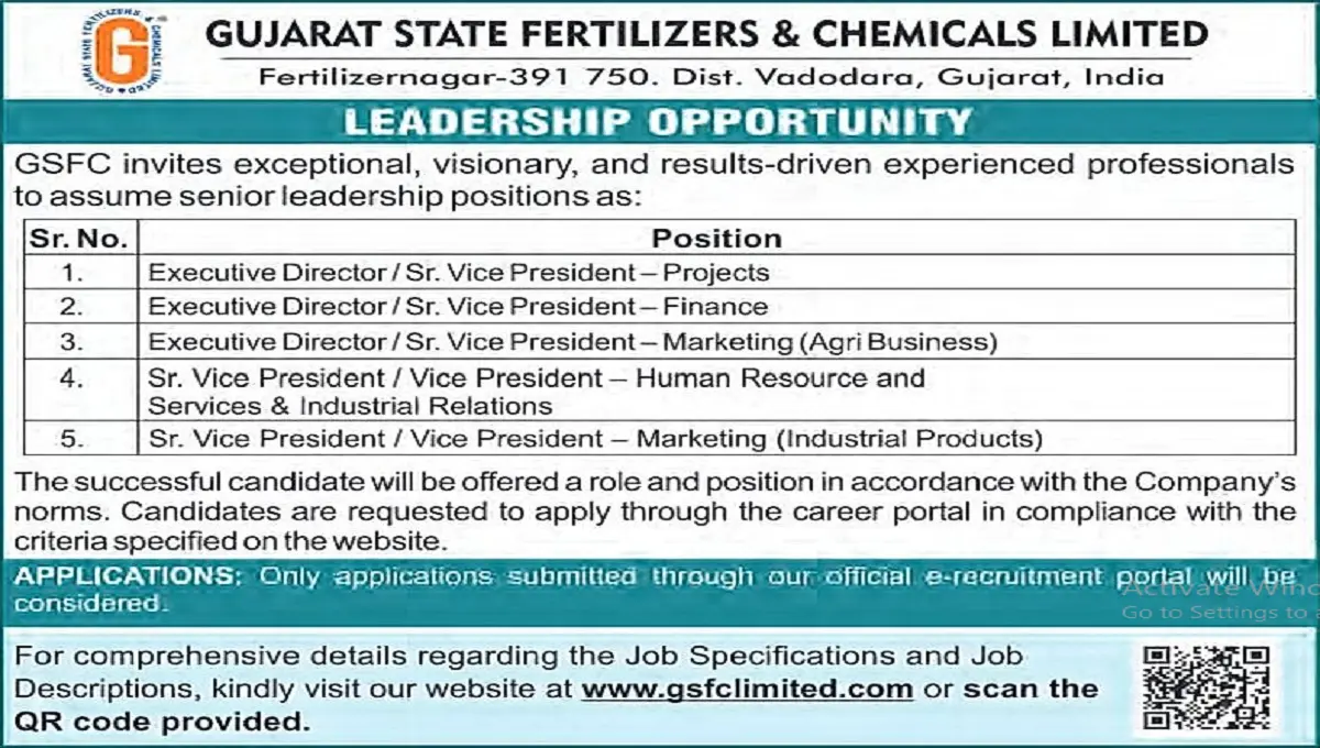 ગુજરાત સ્ટેટ ફર્ટિલાઇઝર્સ એન્ડ કેમિકલ્સ લિમિટેડ (GSFC ભરતી 2025) માં Executive Director અને Vice President પદોની ભરતી 2025. લાયક ઉમેદવારો માટે ઓનલાઈન અરજીની સંપૂર્ણ માહિતી અહીં વાંચો.