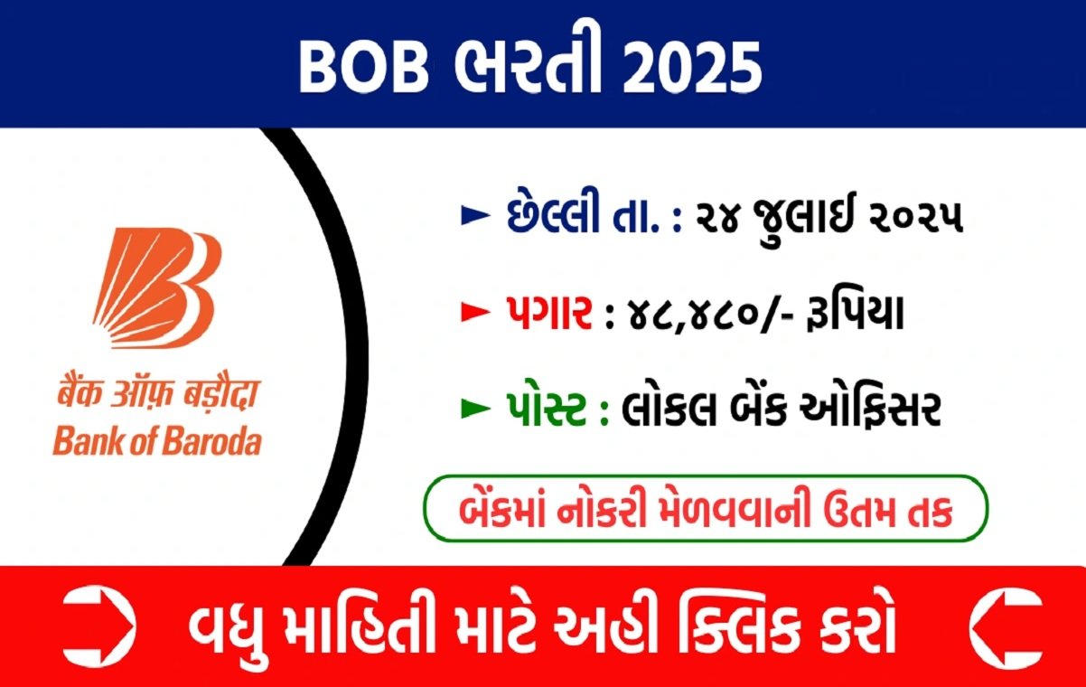 BOB ભરતી 2025: બેંક ઓફ બરોડા ભરતી અંતર્ગત લોકસ બેંક ઓફિસર પોસ્ટની વિગતો શૈક્ષણિક લાયકાત પગાર ધોરણ